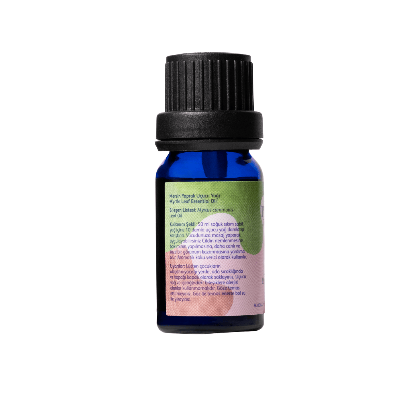 • 50 ml soğuk sıkım baz yağ içine 10 damla Mersin uçucu yağını ilave edip karıştırın ve masajla uygulayabilirsiniz cilt bakımı için bir masaj yağı oluşturun. Sağlıklı cildin korunmasına yardımcı olur.