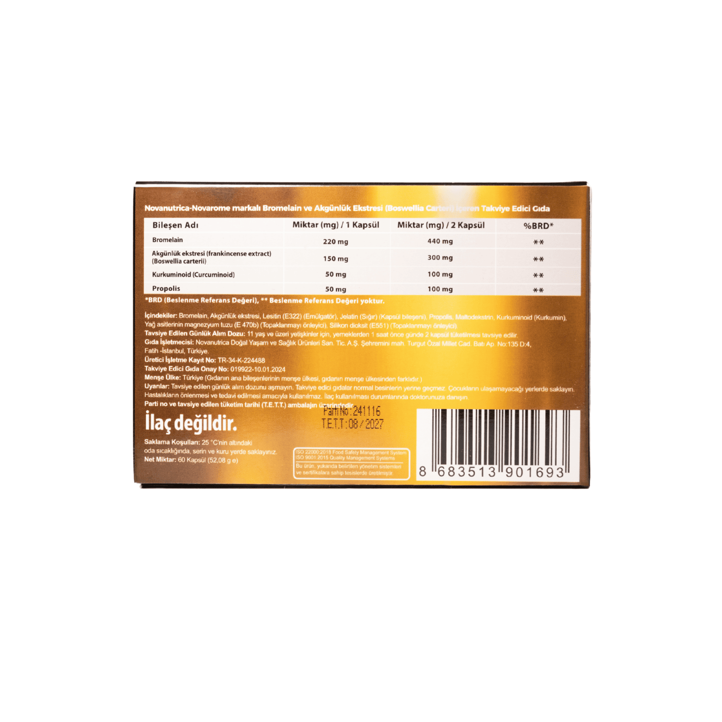 • Ürün, takviye edici gıda statüsünde olup ilaç değildir.